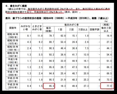 最近の調査である、厚生労働省から発表された平成28年度歯科疾患実態調査(以下参照)によると、歯磨きの普及率は95%以上になっています。