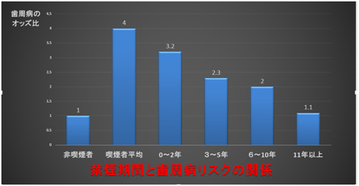 禁煙2年までは歯周病リスクは3,2倍と高いのですが、禁煙を続けているとリスクはだんだんと低下して、禁煙期間が11年を超えると歯周病リスクは1,1倍とほとんど消滅します!