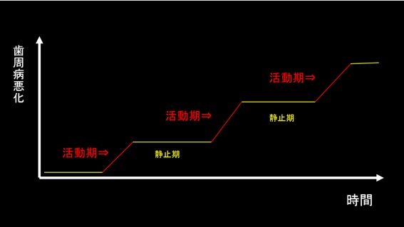 Socranskyによる「ランダムバーストモデル」といい歯周病は時間をかけてゆっくりと進むのではなくて静止期と活動期を繰り返しながら急激に進行する。